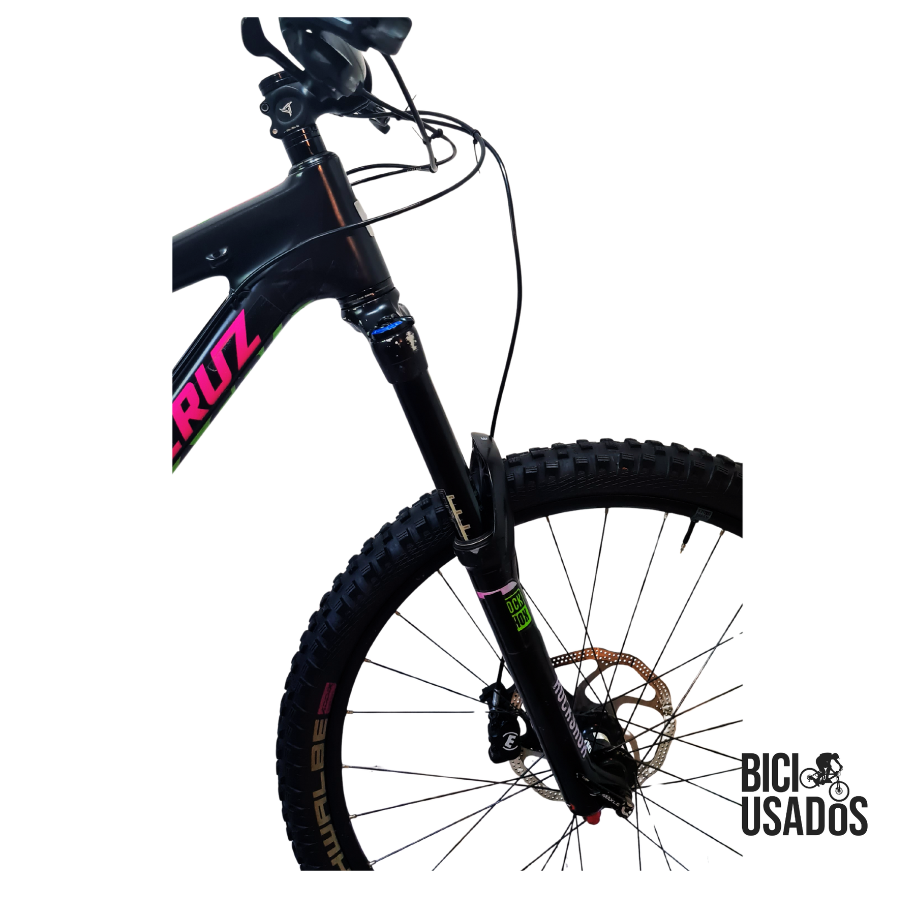 Tiene una Rock Shox Pike RC de 160mm, Fox Float CTD , frenos de 4 pistones Magura MT5, transmisión Sram 1x11v con volante de carbono, retráctil Rock Shox Reverb, etc. Todo lo necesario para pasarlo bien en el cerro.