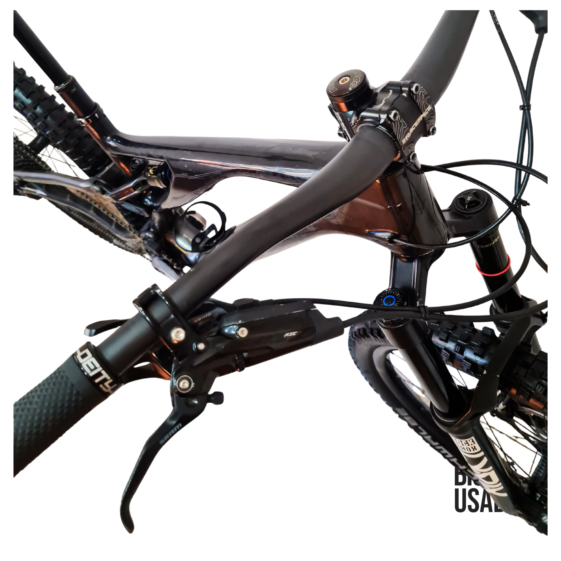 Es un kit armado a medida; horquilla Rockshox Lyrik Ultimate Charger 3 y shock CaneCreek Air IL. Además tiene frenos Sram Code RSC combinados con rotores de 200mm, transmisión Sram GX Eagle de 12 velocidades, retráctil One Up V2 y juego de llantas e-Thirteen TRSR de carbono.
