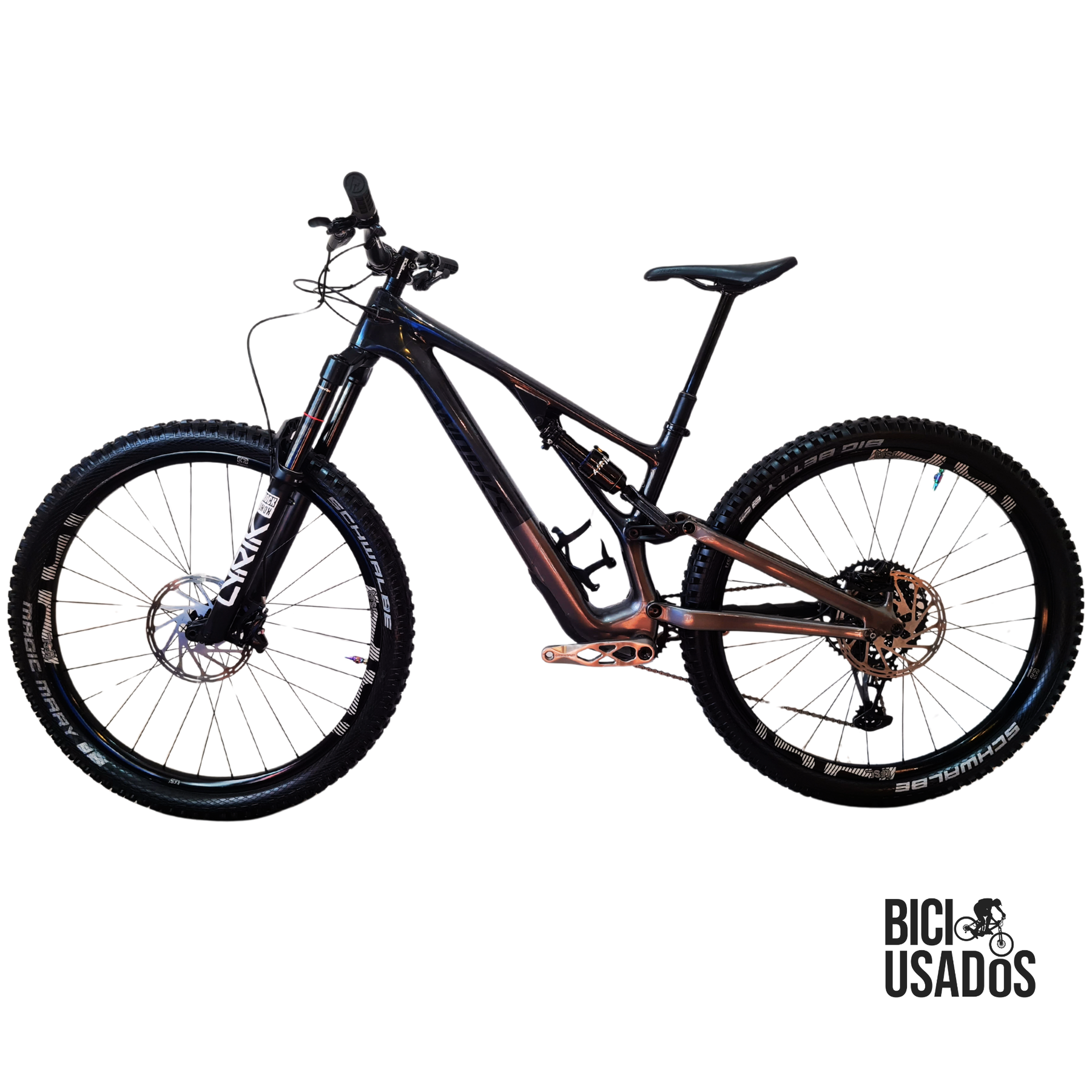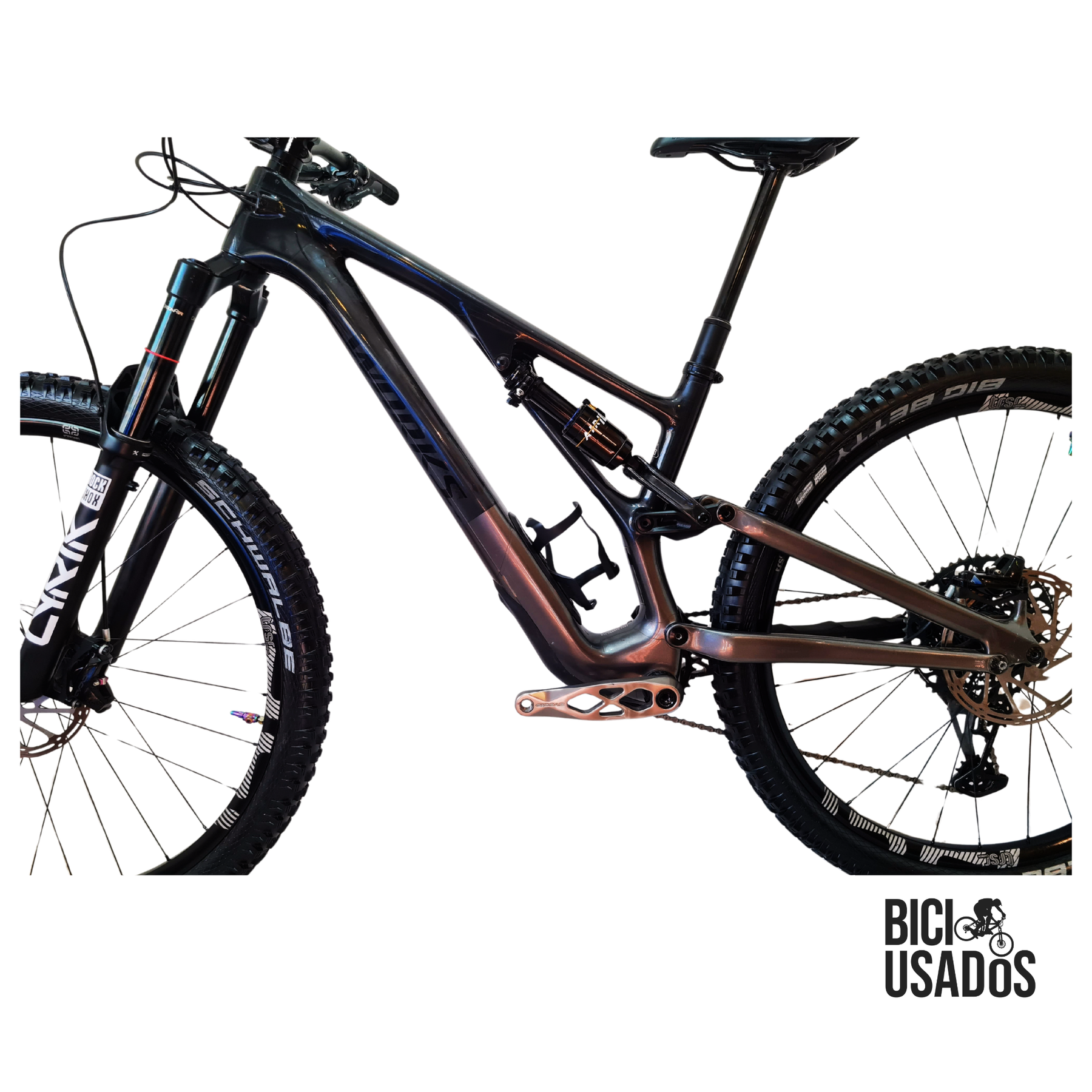 Es una joyita, el modelo S-Works es el tope de línea de la marca, partiendo siempre sobre $6MM su valor nueva. Se va con una buena mantención, actualmente esta full 29er pero incluye el link original de la marca para usarla en Mullet.